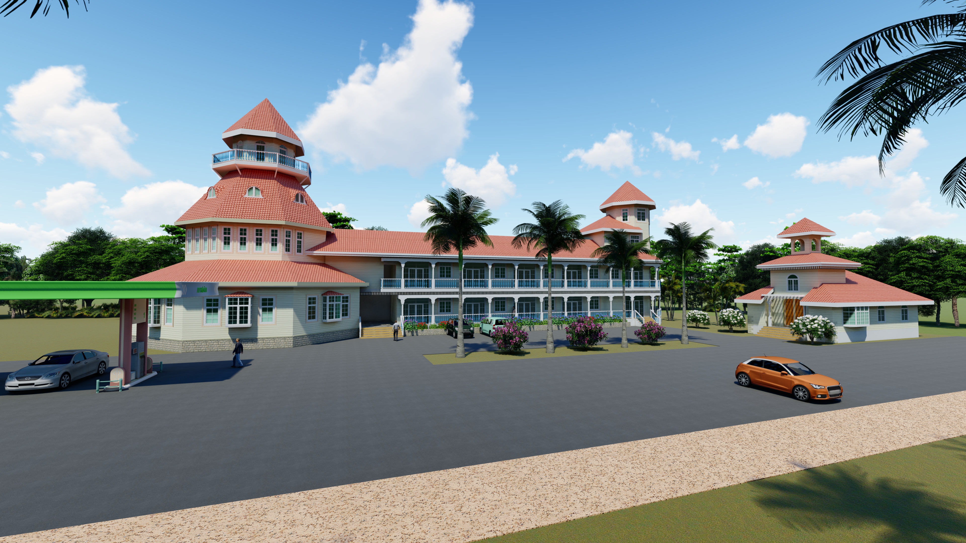 The welcoming complex will feature the first vertical structures in the Project, which are slated to include a two story 14,000 sq. ft. retail and hospitality building, a lighthouse, church and lavish promenade entry way with water feature. The first level of the retail and hospitality building will feature a fueling station, convenience store, residential sales center, souvenir shop and leasable space for local retail vendors. A full-service restaurant and bar operation with management sleeping quarters will complete the second level.